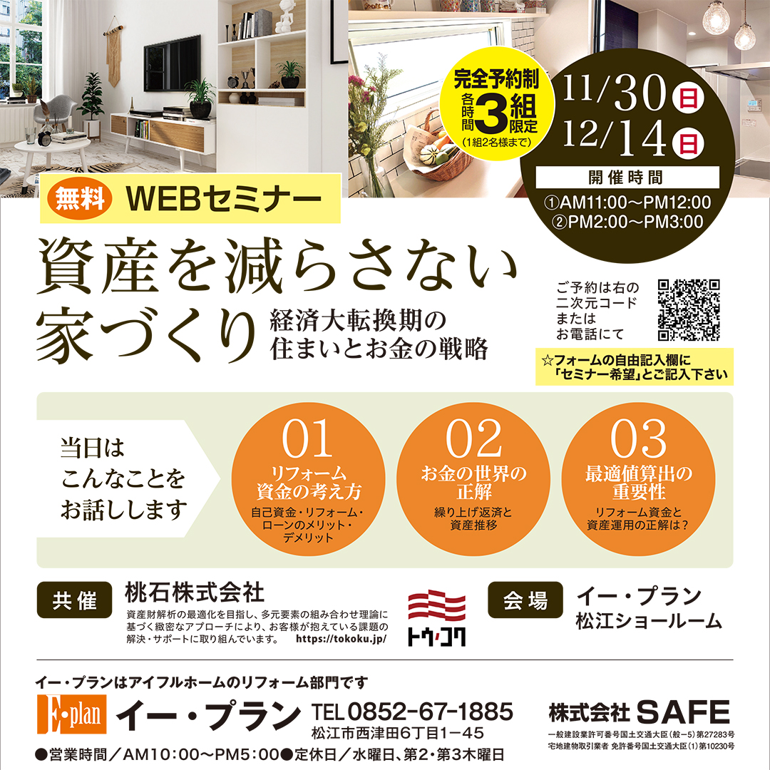 🔶日時:2025年11月30日(日) ①11:00-12:00 ②14:00-15:00 会場:イー・プラン 松江ショールーム