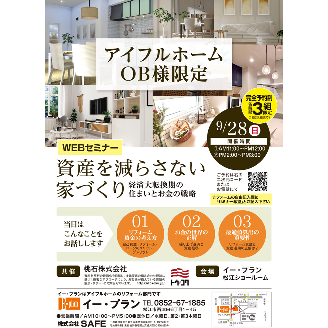 終了しました9/28(日)アイフルホームOB様限定【WEBセミナー】資産を減らさない家づくり